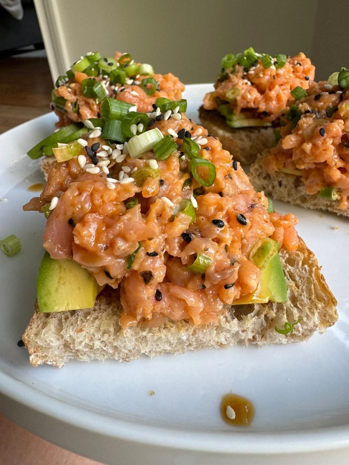 Assemble the toasts: top the toasted sourdough with avocado slices, spicy salmon, honey-soy sauce, and optional scallions and sesame seeds.