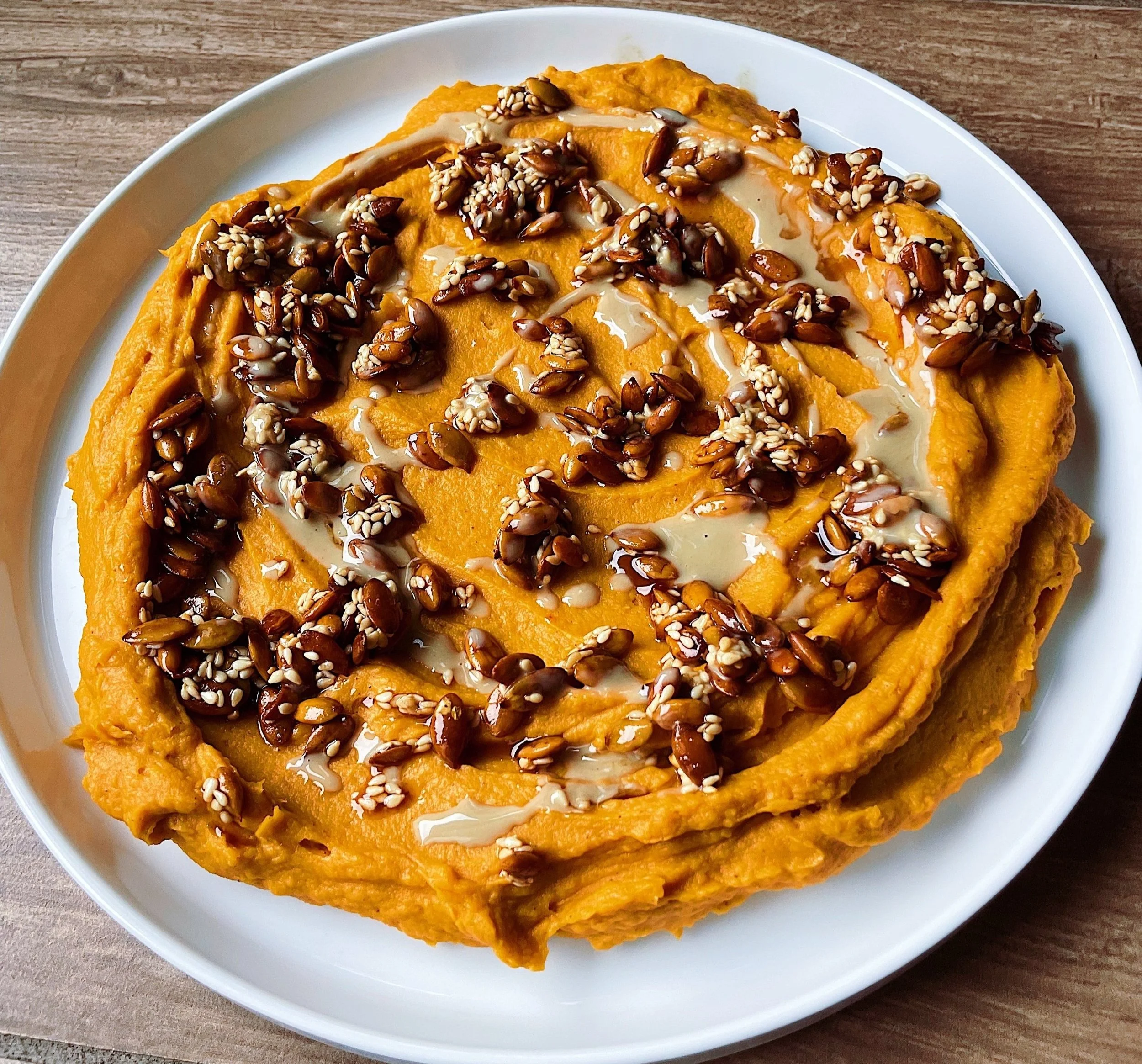To assemble, spread whipped sweet potatoes onto a plate. Spoon browned butter seeds on top, and drizzle extra tahini if you’d like!